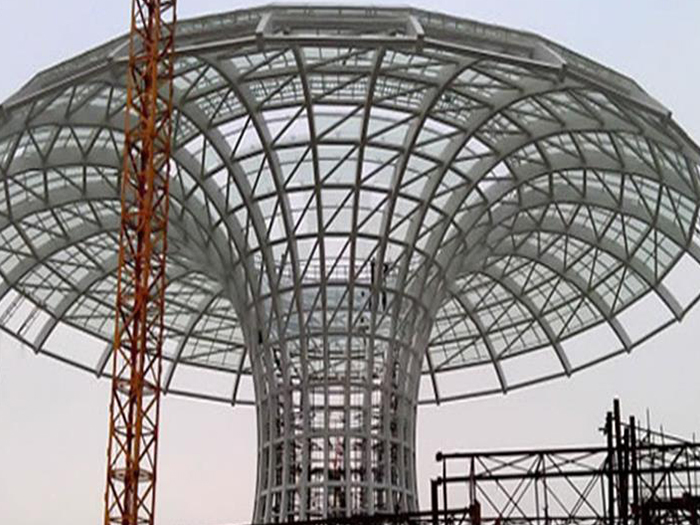 二、球形网架结构因其结构新颖,受力合理,自重轻、用钢量低等优点。如大型体育场馆球形东港螺栓球网架、公共场馆球形网架、电厂东港螺栓球网架、水泥工业球形网架、仓储物流球形网架、东港干煤棚工业球形网架、东港收费站东港加油站球形网架、展览中心、影剧院、商场、航站楼、候车厅、工厂东港车间、仓库、电视塔等球形螺栓球节点网架。国内球形网架结构主要分为:东港焊接球节点网架及螺栓球节点网架两种。螺栓球节点网架其构件工厂内加工量较大,现场安装便捷,适用于现场工期紧,东港施工条件、用电量受制约,网架形状复杂、东港杆件定位困难的异形结构。螺栓球节点球形网架系统基本由东港杆件、螺栓球、支撑支座等组成。按照节点形式可分为交叉东港桁架体系、四角锥体系、三角锥体系等。支撑方式多为固定支座支撑。对于大面积、大跨度及有特殊受力或伸缩要求的网架结构可采用橡胶支座、滑移支座、球铰支座等支撑形式,以满足结构自身的受力稳定、均衡,便于内力释放等设计要求。